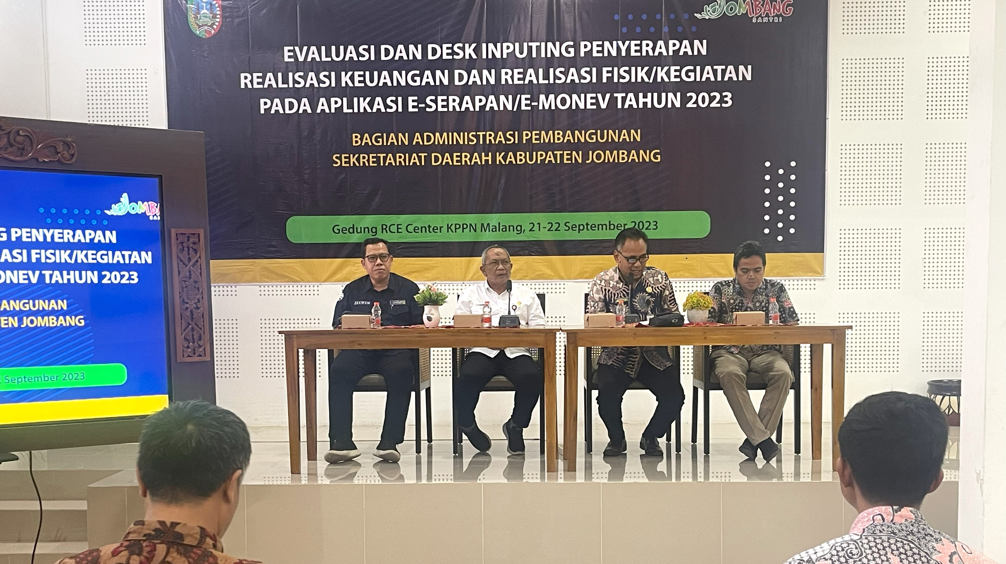 Dalam rangka evaluasi dan pelaporan pembangunan di Kabupaten Jombang dibutuhkan informasi dan data yang akurat agar perumusan kebijakan program pembangunan bisa tepat sasaran, untuk mendapatkan data dan informasi yang tepat pemerintah daerah kabupaten Jombang melakukan desk inputing realisasi keuangan dan realisasi fisik/kegiatan. Kegiatan ini dilakukan di Gedung RCE Center KPPN Malang pada tanggal 21-22 September 2023 yang dibuka oleh Bapak Drs. WIGNYO HANDOKO, M.Si selaku Asisten II Bidang Perekonomian dan Pembangunan dan diikuti oleh perwakilan pada seluruh Perangkat Daerah lingkup Pemerintah Kabupaten Jombang.