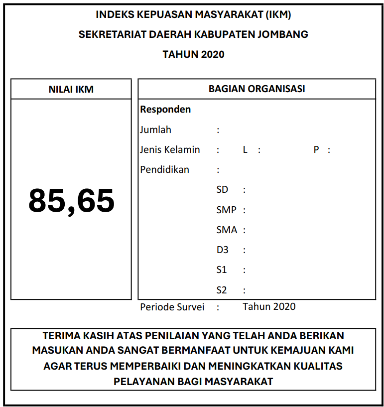 INDEKS KEPUASAN MASYARAKAT TAHUN 2020 SEKRETARIAT DAERAH KABUPATEN JOMBANG (BAGIAN 0RGANISASI)