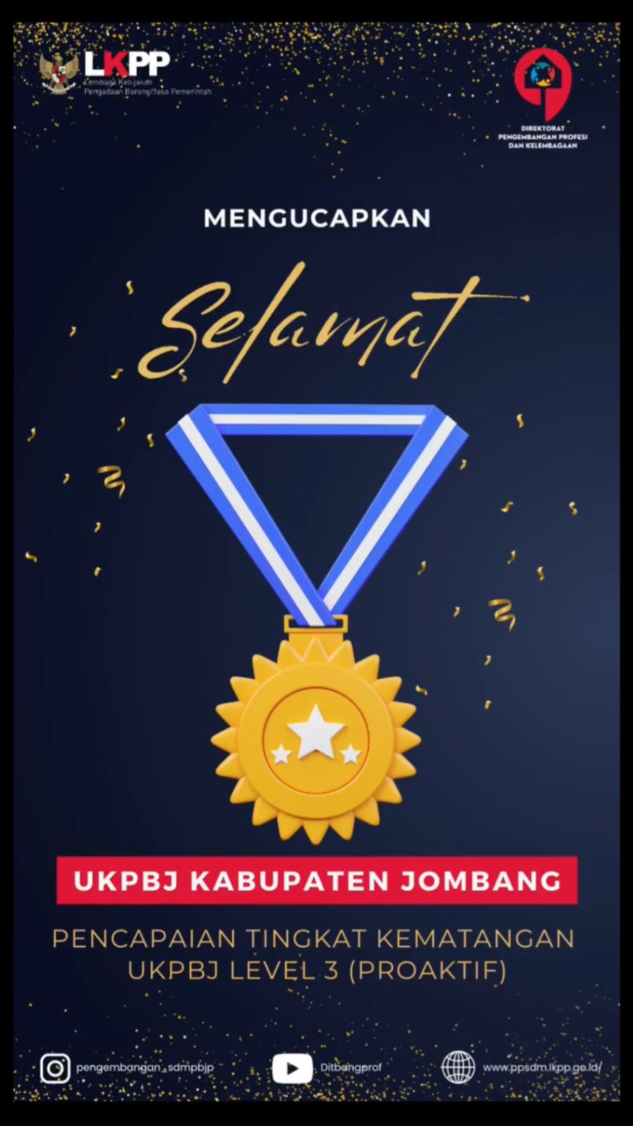 Melalui verifikasi dokumen bukti dukung yang disampaikan pada Sistem Informasi Model Kematangan UKPBJ (SIMKU), UKPBJ Pemerintah Kabupaten Jombang telah memenuhi kelengkapan atribut pada sembilan variabel (9/9) untuk mencapai Tingkat Kematangan Proaktif (Level 3). Untuk itu, kami mengucapkan selamat dan menyampaikan apresiasi atas pencapaian tersebut. Selanjutnya sesuai amanat pasal 29 Peraturan LKPP Nomor 10 Tahun 2021, UKPBJ Pemerintah Kabupaten Jombang dapat mengajukan permohonan penilaian untuk ditetapkan sebagai Pusat Keunggulan Pengadaan di tingkat Proaktif kepada LKPP paling cepat 1 (satu) tahun setelah surat ini diterbitkan. Oleh karena itu, kami mohon dukungan dan komitmen Saudara untuk mengimplementasikan seluruh atribut yang telah dibangun agar UKPBJ Pemerintah KabupatenJombang berhasil menjadi Pusat Keunggulan Pengadaan di tingkat Proaktif.