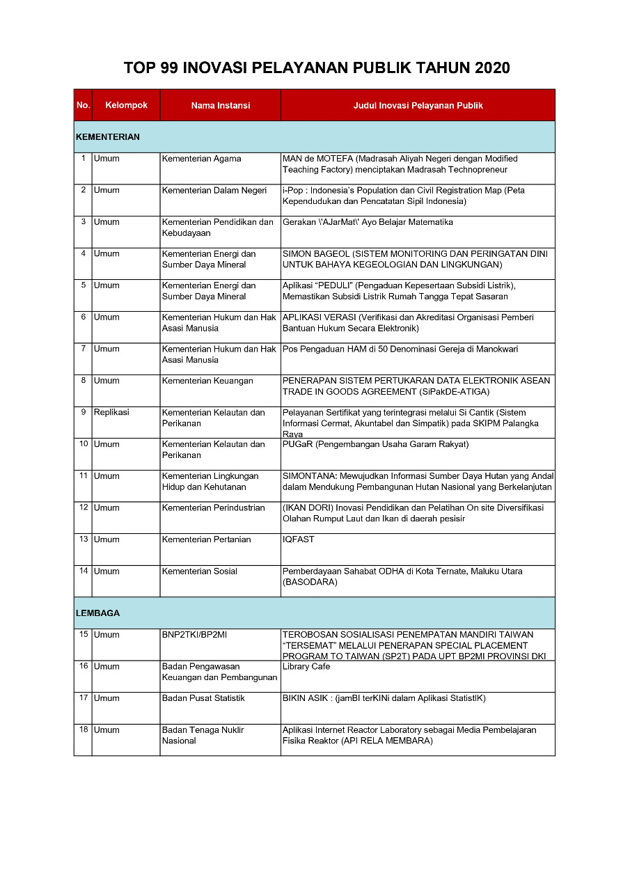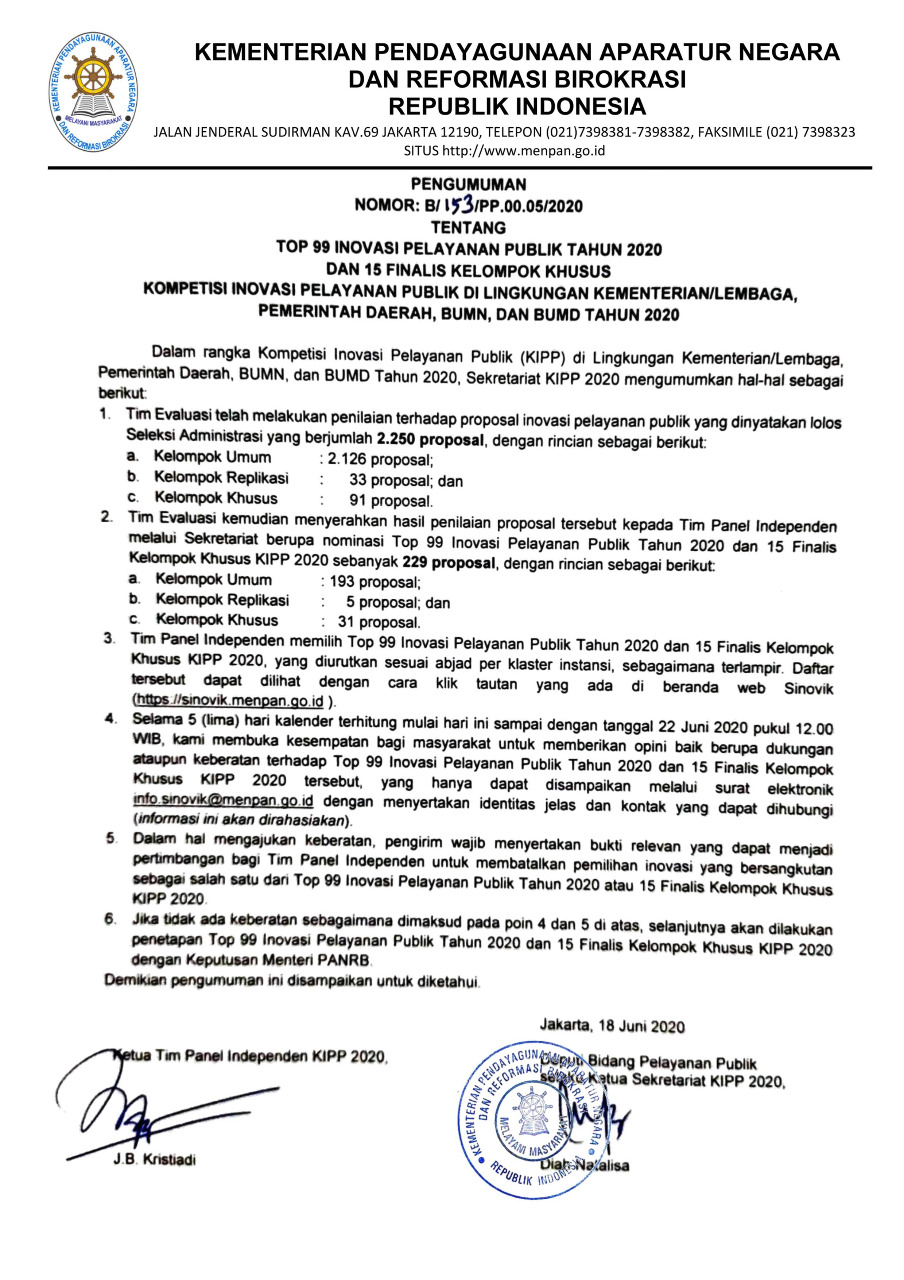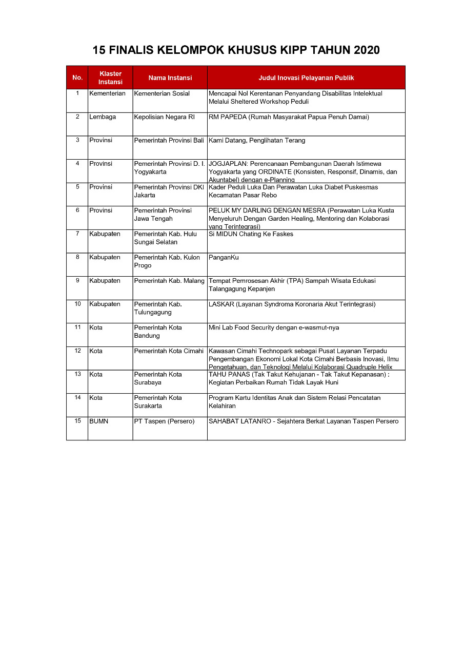 Pemerintah Kabupaten Jombang melalui Inovasi Ekowisata Wonosalam Permata Hati dari Dinas Lingkungan Hidup berhasil menorehkan prestasi kedalam Top 99 Inovasi Pelayanan Publik yang diselenggarakan oleh Kementerian Pendayagunaan Aparatur Negara dan Reformasi Birokrasi. Hasil resmi Top 99 Inovasi Pelayanan Publik tersebut tertuang pada Pengumuman Nomor : B/153/PP.00.05/2020 tentang Top 99 Inovasi Pelayanan Publik Tahun 2020 dan 15 Finalis Kelompok Khusus Kompetisi Inovasi Pelayanan Publik Di Lingkungan Kementrian / Lembaga / Pemerintah Daerah, BUMN dan BUMD Tahun 2020.